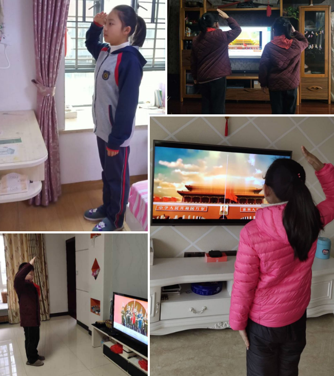一個(gè)個(gè)穿戴整齊的同學(xué)們,他們胸前佩戴紅領(lǐng)巾在家中面向直播中的國(guó)旗肅立,聽(tīng)指揮高唱國(guó)歌,少年隊(duì)員敬隊(duì)禮。立下凌云志,致敬逆行者,當(dāng)好接班人。
